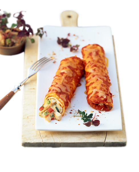 Marinierte Weizentortilla, gefüllt mit Hähnchenbruststreifen und Zwiebelcreme, mit pikanter Tomaten-Enchilada-Sauce umhüllt und Cheddar-Mozzarella-Käsemix bestreut
