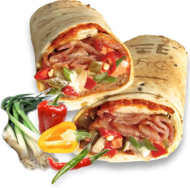 Weizentortilla, gefüllt mit gebratenem Bacon, Jalapeno-Cocktail und einer pikanten BBQ-Dip-Sauce