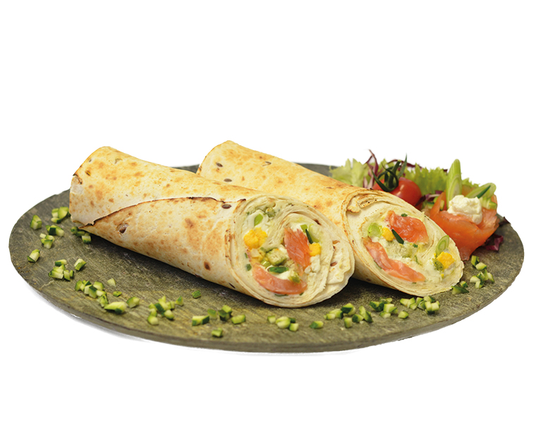Weizen-Leinsamentortilla gefüllt mit Räucherlachs und Lauch-Meerrettich-Frischkäse