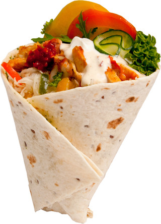 Leinsamen-Weizentortilla, gefüllt mit original Pita Brot, Gyros-Hähnchenfleisch in pikanter Sauce