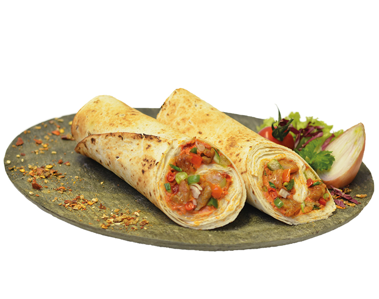 Weizen-Leinsamentortilla gefüllt mit Hühnerbrust, pikantem Peppadew-Cocktail und Tikka-Dip-Sauce